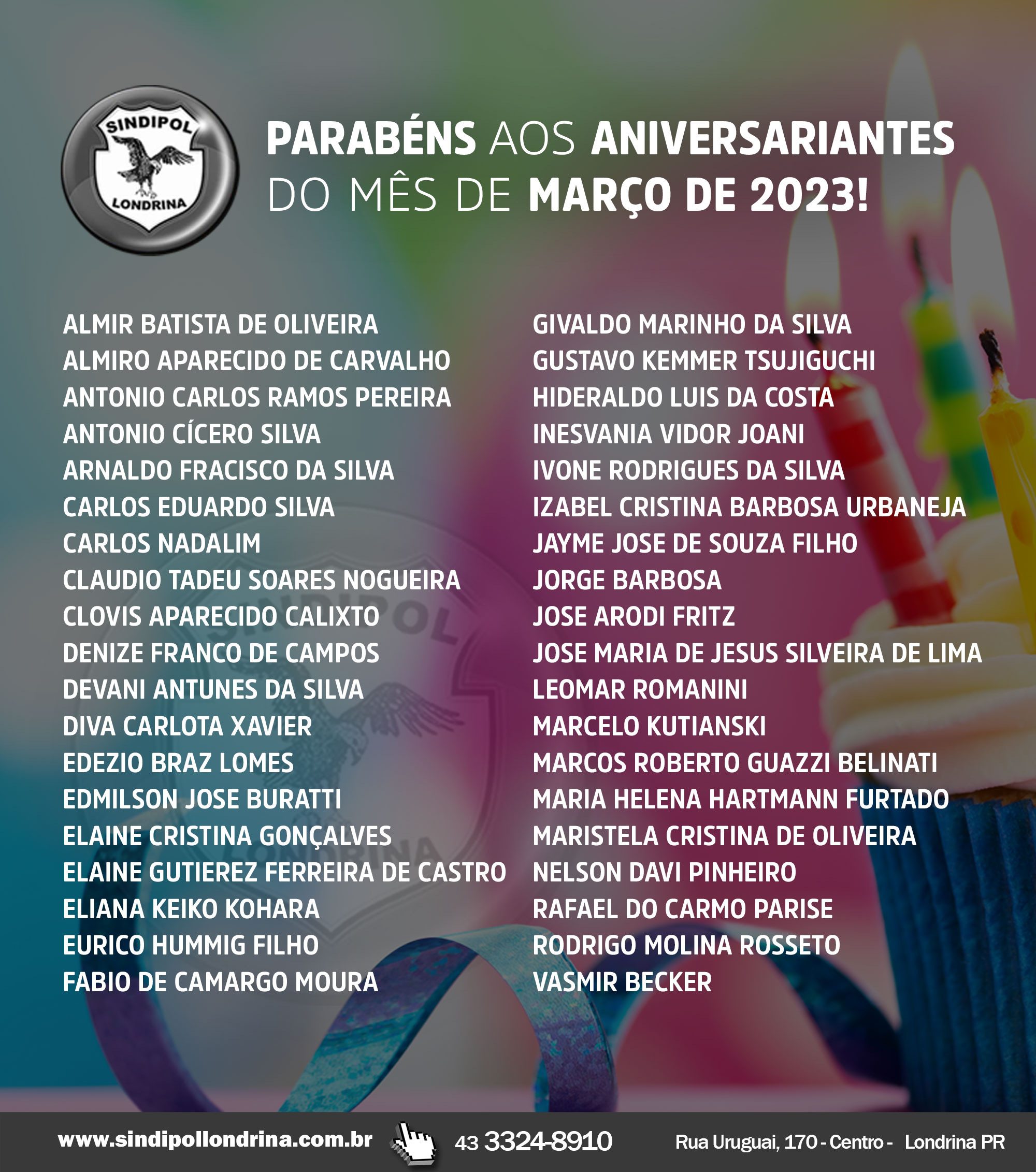 Nossa singela homenagem a todos os aniversariantes do mês de MARÇO DE 2023!👏👏👏𝓟𝓪𝓻𝓪𝓫é𝓷𝓼:🧁Almir Batista de Oliveira🧁Almiro Aparecido de Carvalho🧁Antonio Carlos Ramos Pereira🧁Antonio Cícero Silva🧁Arnaldo Fracisco
