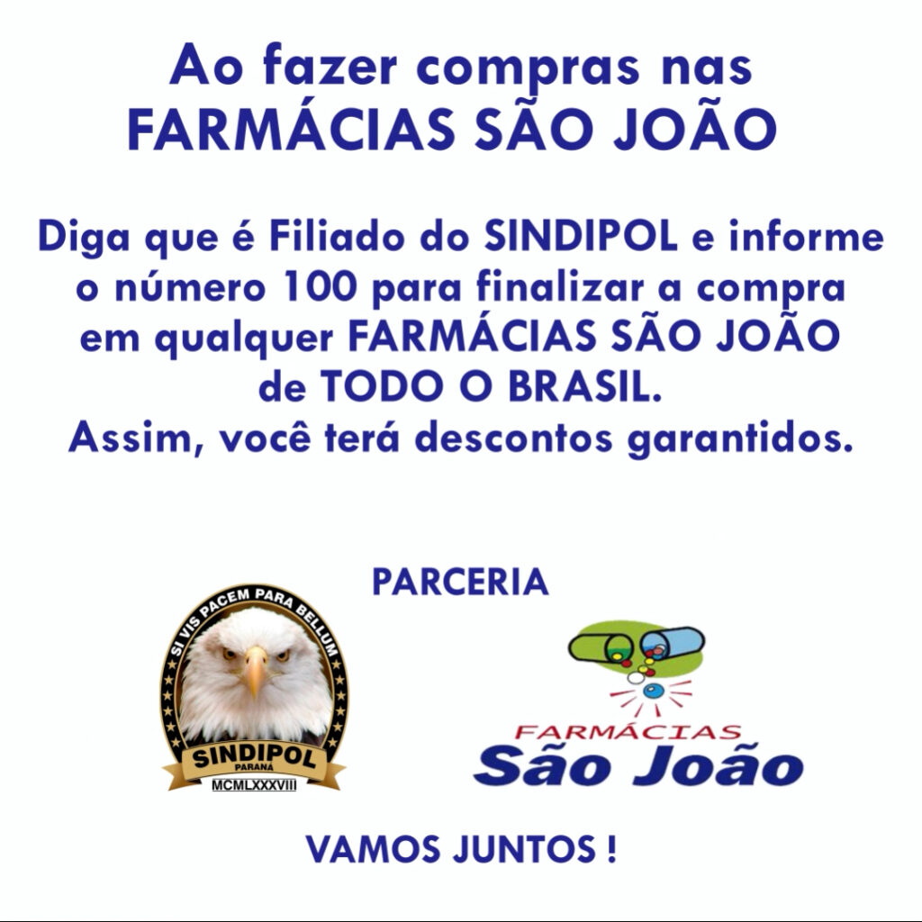 Ao fazer compras nas Farmácias São João, diga que é filiado do Sindipol e informe o número 100 para finalizar a compra em qualquer Farmácias São João de todo Brasil.